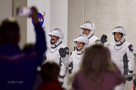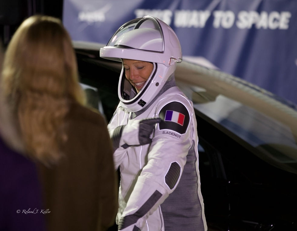 As she steps out of the Neil A. Armstrong Operations and Checkout Building, Sophie Adenot waves, points to the flag on her sleeve, and walks toward the rocket. Orbit begins here.